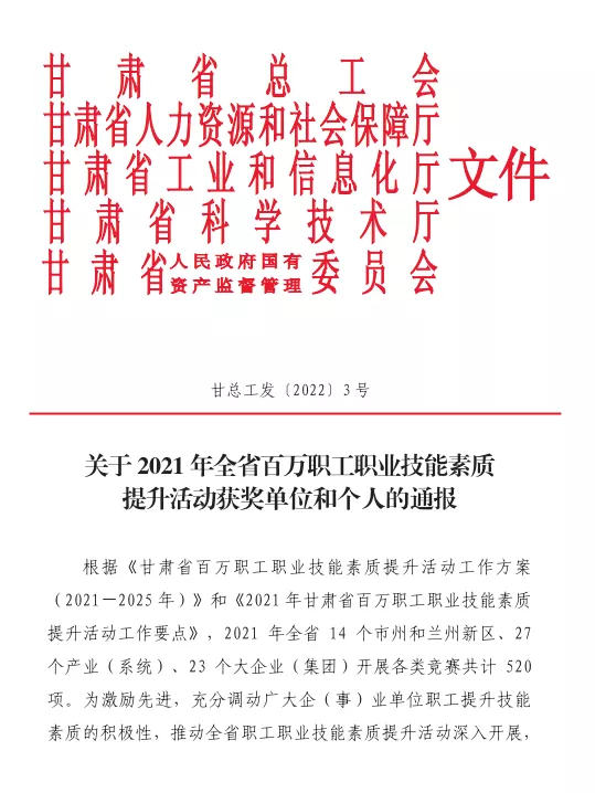 1月21日,甘肃省总工会、省人力资源和社会保障厅、省工业和信息化厅、省科学技术厅、省人民政府国有资产监督管理委员会联合公布了《关于2021年全省百万职工职业技能素质提升活动获奖单位和个人的通报》,英国365集团公司专精特新公司孙占栋、刘恒、林占强、骆振玺、刘恒5名职工荣获“2021年甘肃省技术标兵”称号。