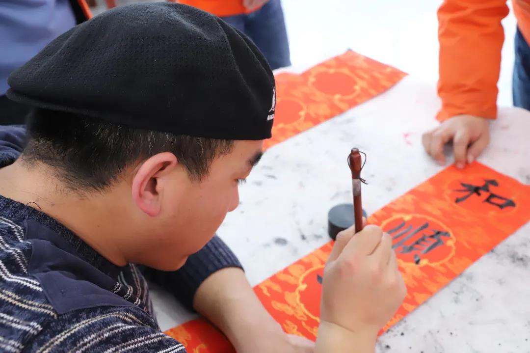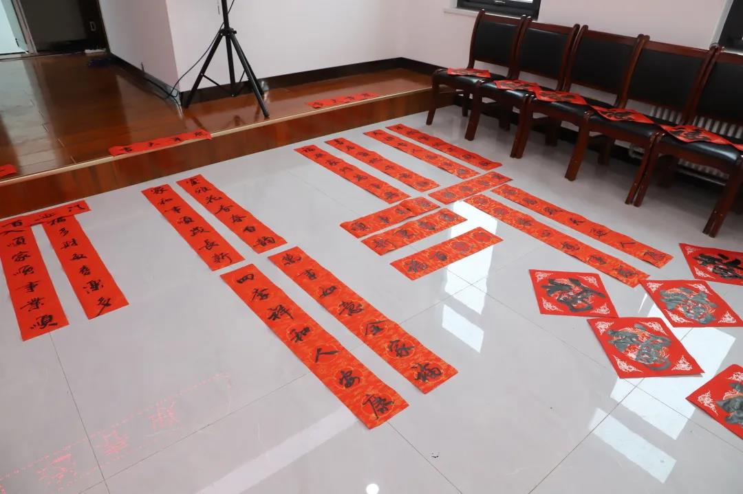 笔走龙蛇间,一张张笔酣墨饱、寓意吉祥的“福”字、春联跃然纸上。集团各单位书法爱好者和员工们早早来到书写现场,一边帮着铺纸调墨,一边井然有序地向书法家们“求”取自己中意的春联和美好祝福。两个多小时,书法家们共写出了200余幅作品,并现场讲解释义、互动交流,活动现场铺满了春联和福字,形成了一片热闹非凡的红色海洋。