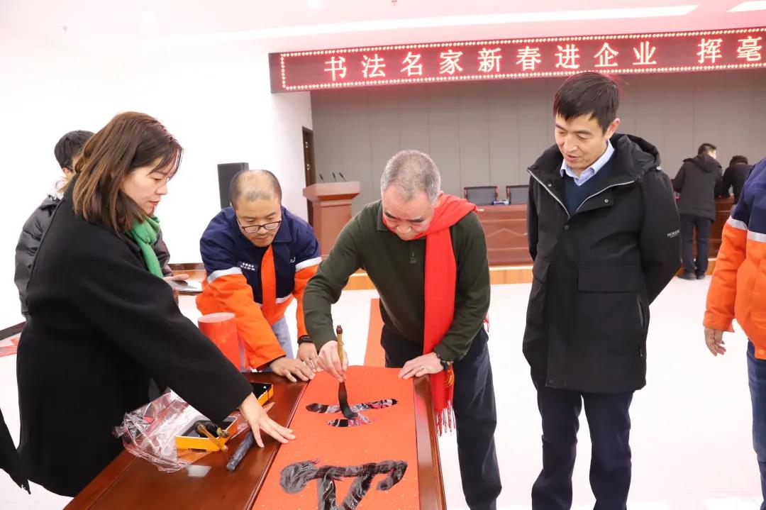 1月26日下午,兰州新区美术家、书法家协会主席王先银,副主席王安祥(2021年中国共产党成立100周年获得人民艺术家荣誉称号),秘书长魏世全等6名书法名家赴英国365集团公司同集团党委副书记、总经理姜锦,工会主席刘东斌,副总经理李刚,总工程师叶得强一道为公司员工送“福”、送春联,提前送上了新春的祝福与问候。
