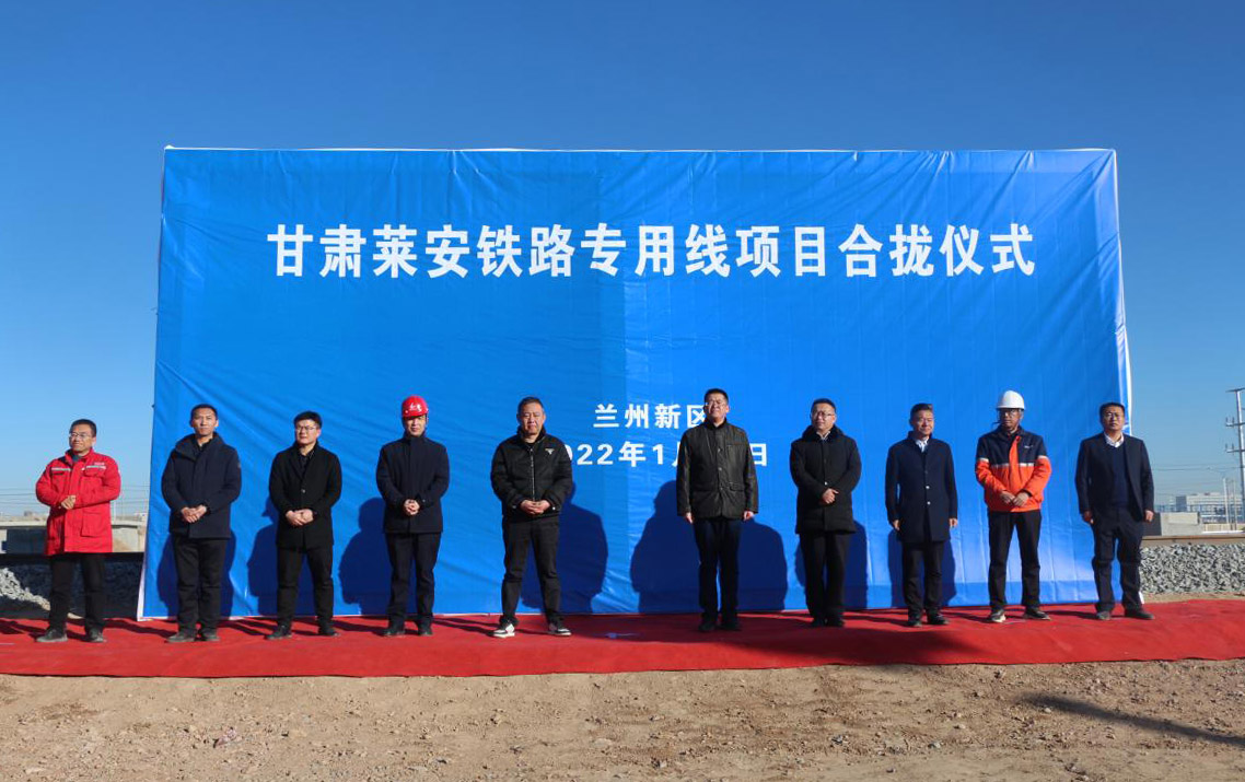 2022年1月19日上午10时,在化工物流园货场举行甘肃莱安铁路专用线项目合拢仪式。兰州新区英国365集团公司总经理姜锦、兰州新区商投集团总经理王坚民及中铁二十一局、甘肃莱安能源有限公司领导出席仪式。