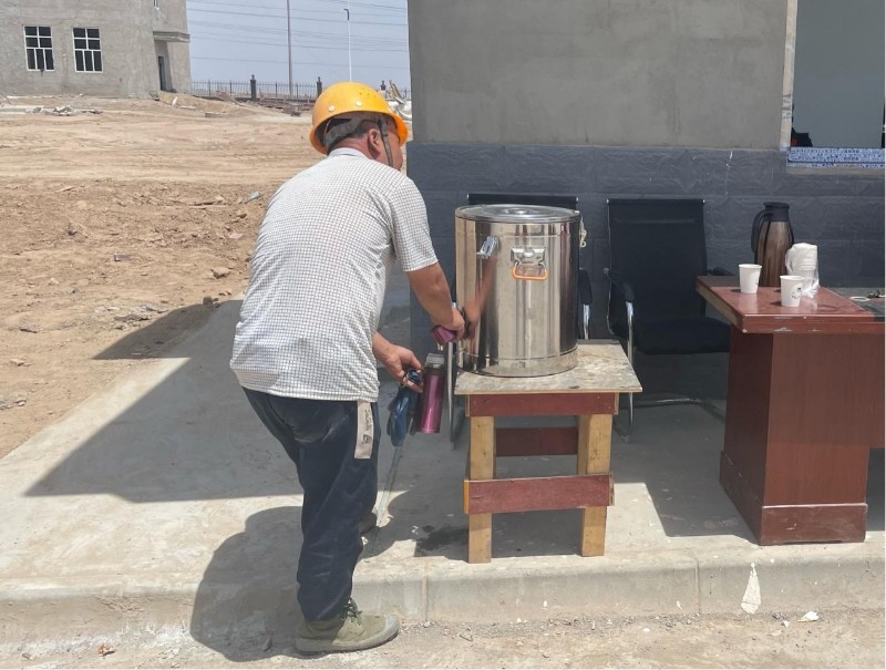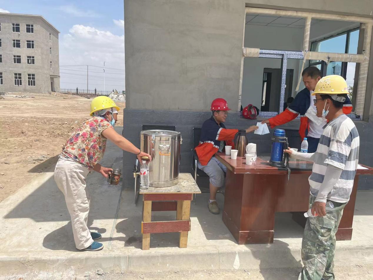 为确保项目顺利竣工,化学工程公司为施工一线工人送去了清凉饮品,绿豆汤、酸梅汤等,并每日安排专人送到施工现场,让工友们从心底感受到公司送来的清凉关爱,“凉”在身上,“暖”在心间。项目部管理人员叮嘱现场施工人员要注意安全,在夏日工作中一定要注意防暑,牢记高温季节施工安全注意事项,合理安排作息时间,注意劳逸结合。