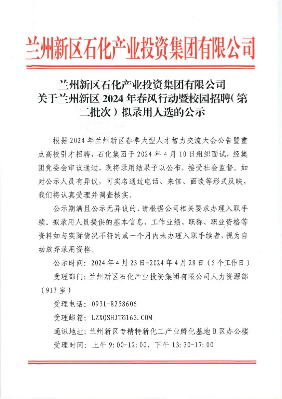 英国365集团公司 关于兰州新区2024年春风行动暨校园招聘(第二批次)拟录用人选的公示