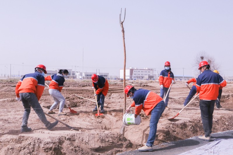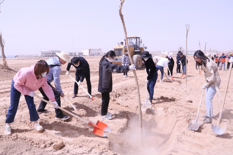 活动中,大家热情高涨,分组协作,挥动铁锹,扶正树苗,填土踩实,提桶浇水一气呵成,忙而有序,植树现场呈现出一副热火朝天的劳动景象。为保证树苗的成活率,专业人员现场对苗木栽植、浇水、养护等工作进行全程指导和监督,确保植树造林质量。经过大家的辛勤劳动和努力,一株株树苗迎风矗立,给化工园区增添了一道亮丽的风景线。