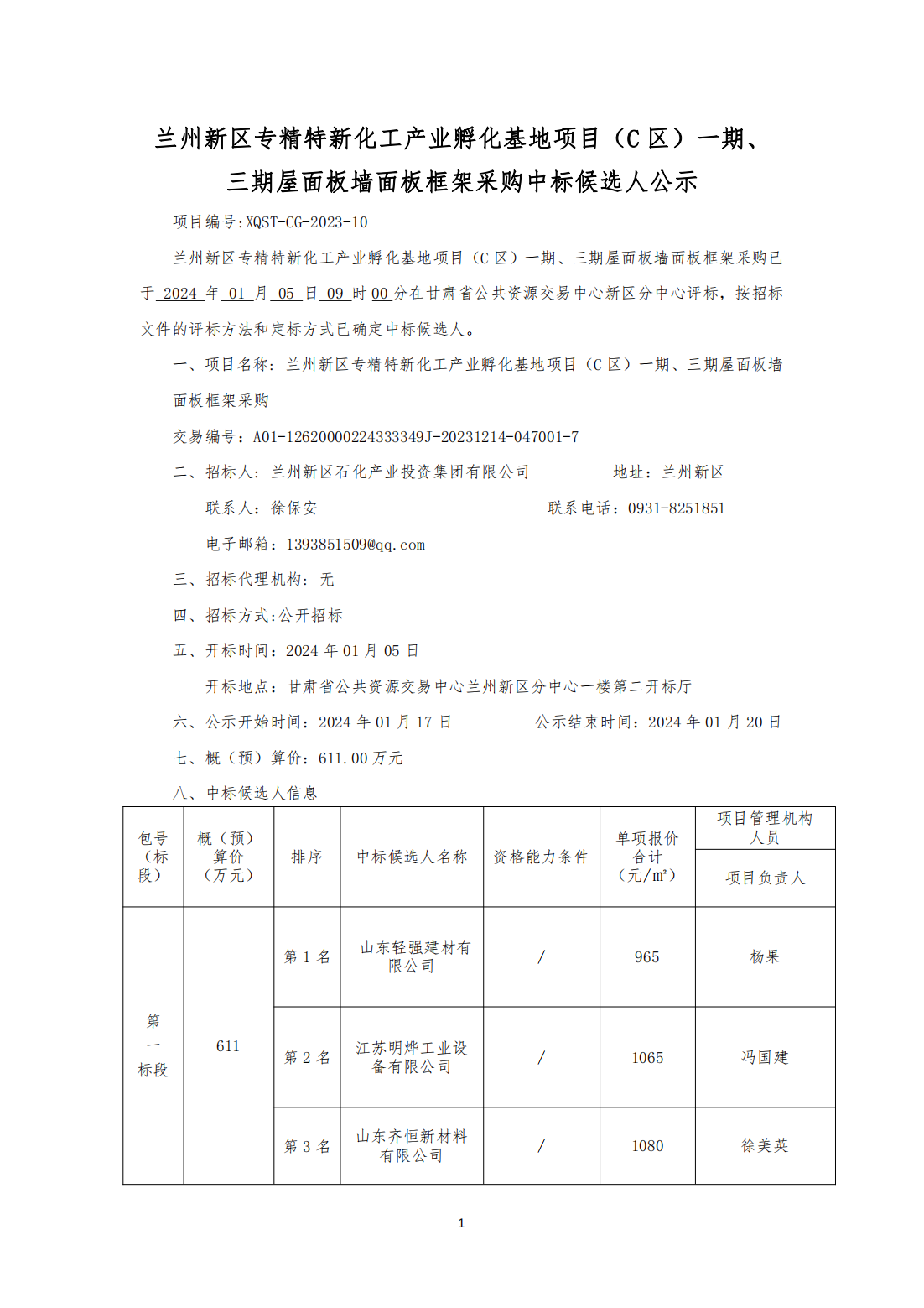 <title>兰州新区专精特新化工产业孵化基地项目（C 区）一期、 三期屋面板墙面板框架采购中标候选人公示 - 项目建设 - 专题专栏</title>